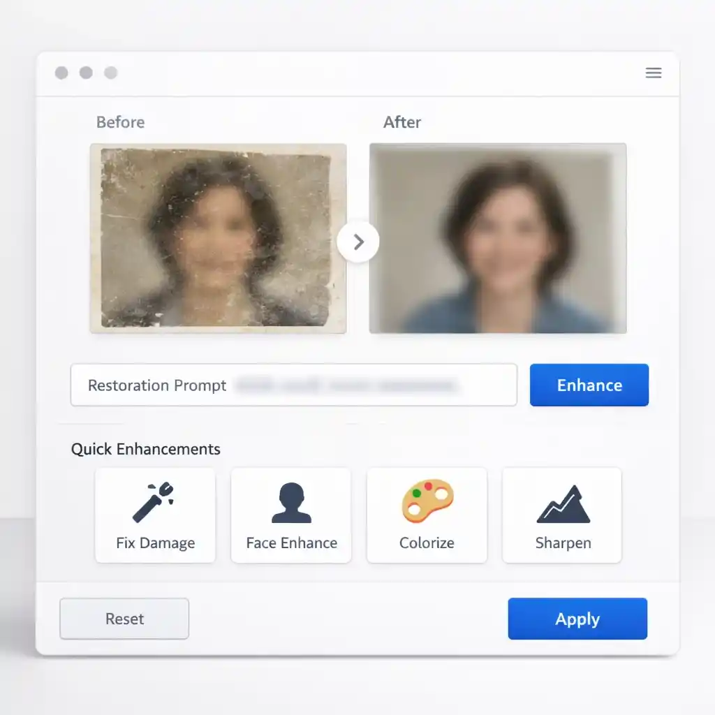 Questa pagina è focalizzata sul caso d'uso del miglioratore di foto AI: migliorare la qualità delle foto, ripristinare immagini sbiadite e potenziare foto vecchie o sfocate online.